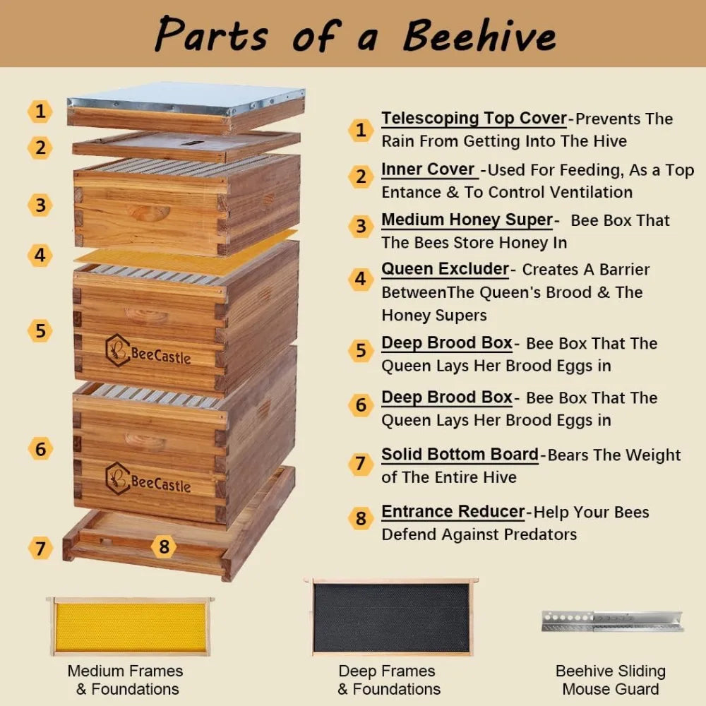 - [Beehive Starter Kit]- This 10 frame bee hive starter kit includes Metal Top Cover, Inner Cover, Queen Excluder, Solid Bottom Board, Entrance Reducer, Beehive Sliding Mouse Guard, Screws and Nails for Assembly, 1 Medium Box, 2 Deep Boxes and 30pcs beehive frames and beeswaxed foundations.